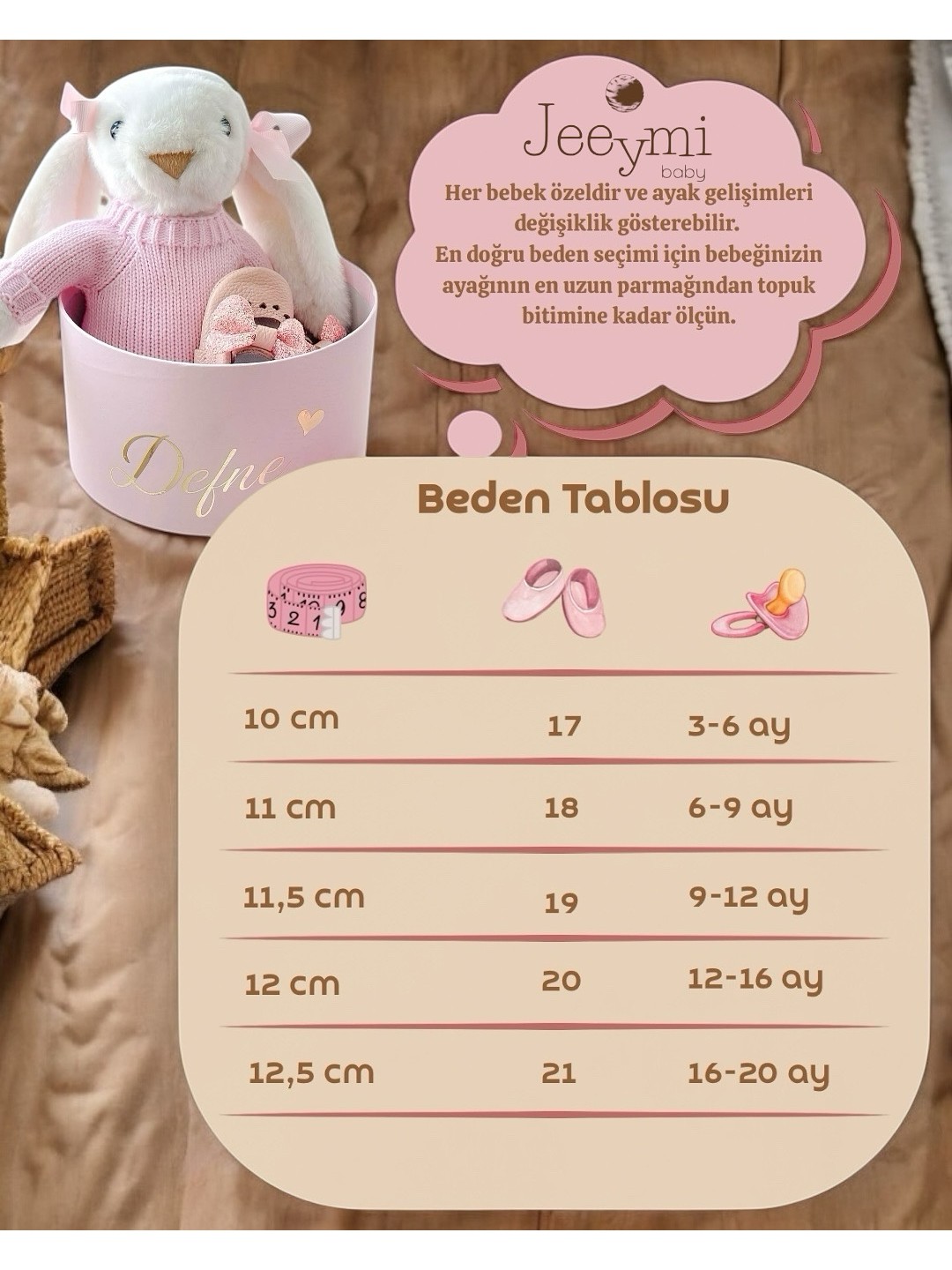 Not: Jeeymi Baby isimli ilk adım ayakkabıları hazırlık süreci 10 iş günüdür. Sipariş verirken bu süreyi göz önünde bulundurmalısınız. Kişiye özel baskı ile imal edilen ürünlerin iade ve değişimi yapılmamaktadır. Ayak ölçüsü alarak sipariş oluşturunuz.